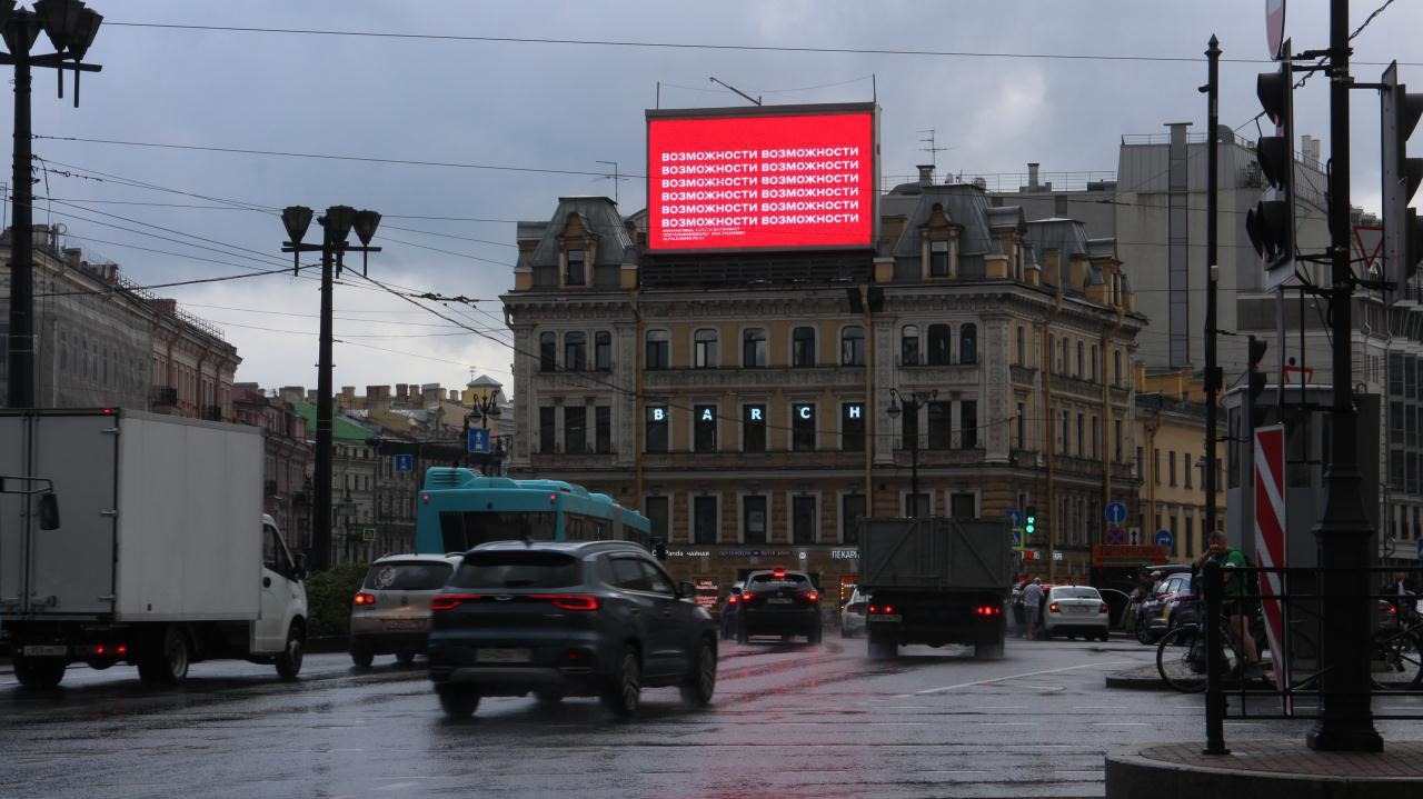 Пример креатива на медиафасаде в центре Санкт-Петербурга. На первом экране появлялось слово «возможность», которое заполняло всю поверхность и переходило в обычный креатив.