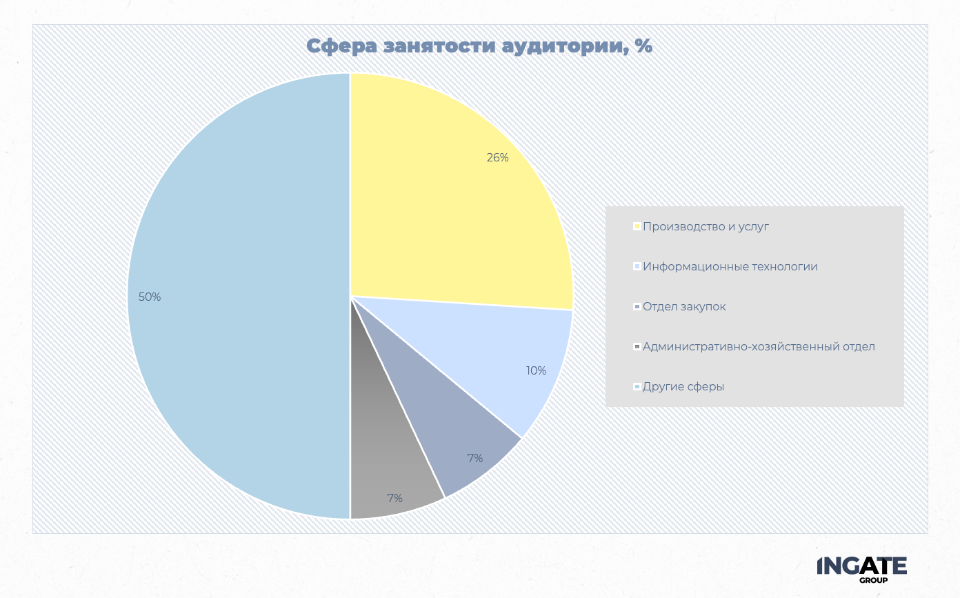 “Помимо этого, во время аудита кампаний и аудитории, мы обнаружили, что большая часть аудитории, приходящей по узким таргетингам, например, покупка продукции или поиск релевантных товаров, относится к сегменту B2B. Более 40% опрошенных пользователей осуществляют деятельность, направленную на взаимодействие с юрлицами.