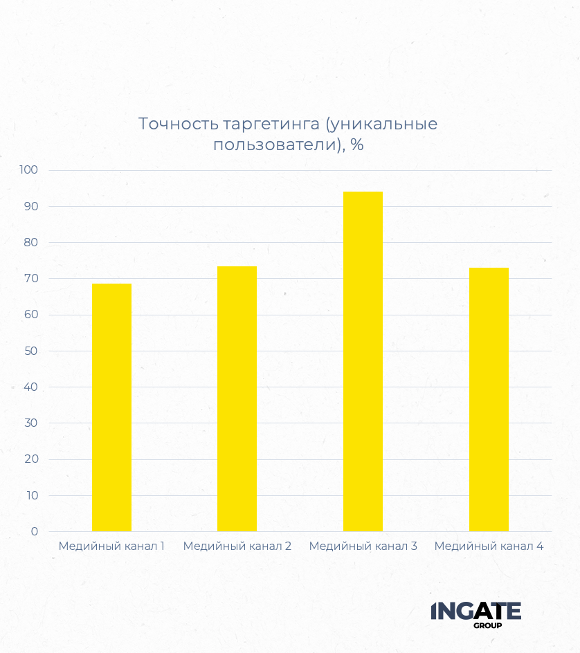 В результате мы увидели, что точность попадания в ЦА в разных каналах варьировалась от 68,6% до 94,2%.На основании этих результатов мы принимали решения о масштабировании тех или иных каналов. Это отличные показатели, подтверждающие, что проработка медийных платформ до запуска рекламной кампании — шаг, который позволяет минимизировать открутку бюджета на нецелевые каналы.