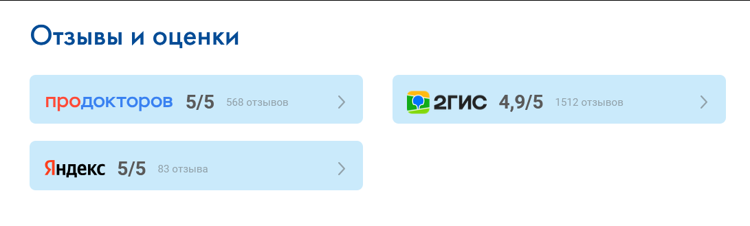 Создали блок с рейтингом отзывов из сторонних сервисов на всех страницах сайта. Таким образом избавили клиентов от необходимости тратить время на поиск дополнительной информации.