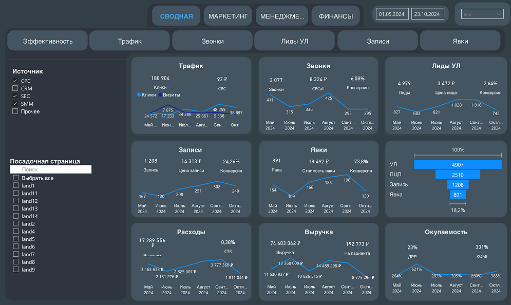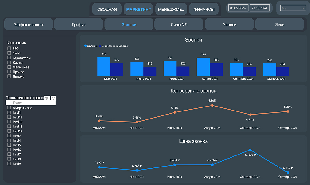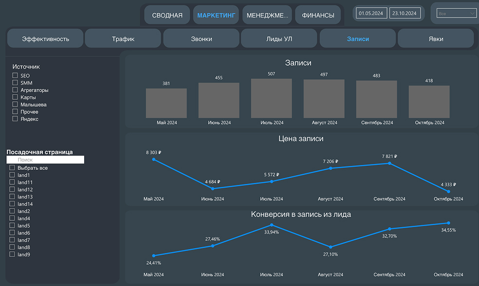- Подключаем сквозную аналитику: отслеживаем звонки, заявки, записи через коллтрекинг, CRM и веб-формы.